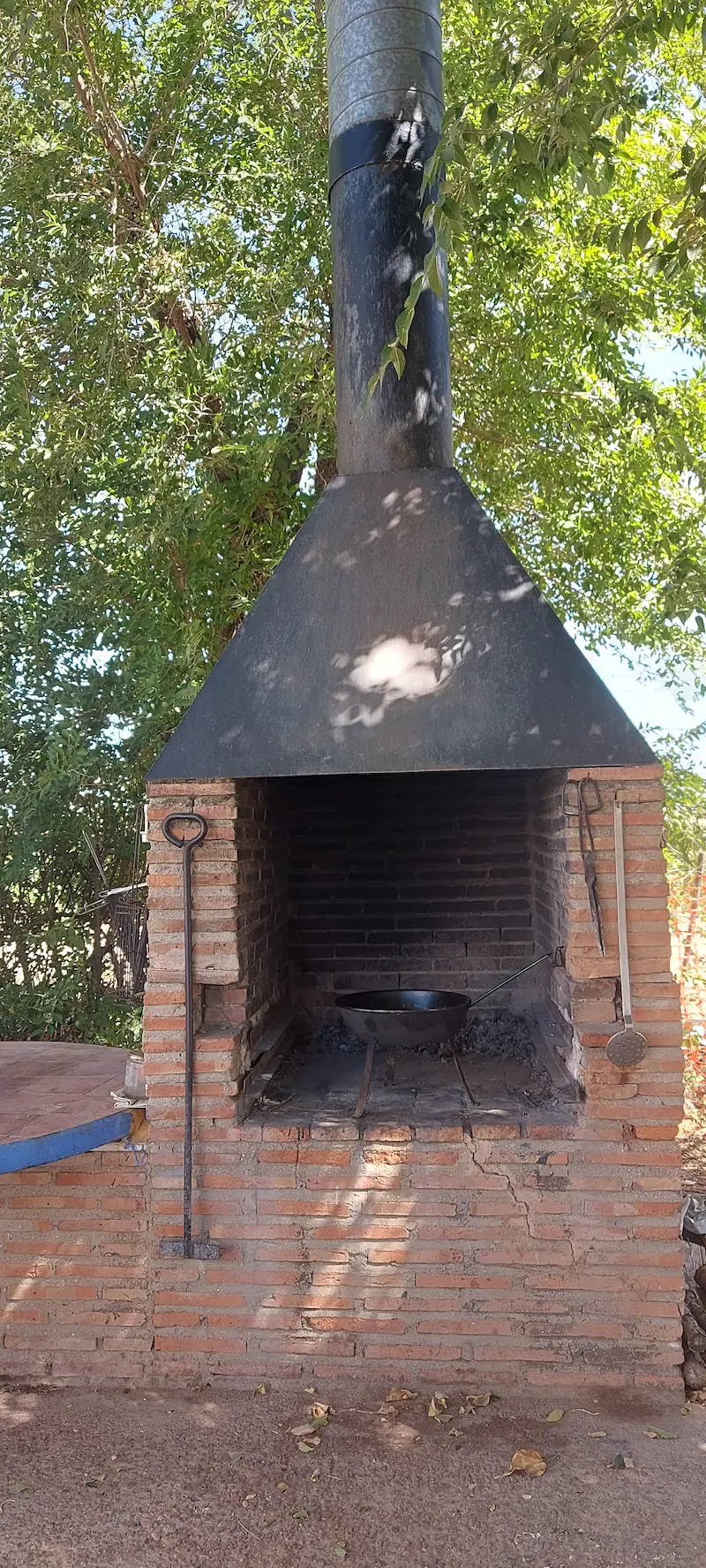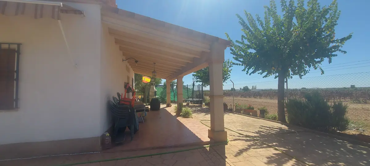 La construcción secundaria —80 m² más 50 m² de porche techado— dispone de una auténtica cocina campera con chimenea de obra, tres dormitorios y baño propio. Un espacio diseñado para reunir a los que más quieres: comidas de verano, noches de barbacoa, celebraciones familiares que quedan en la memoria.