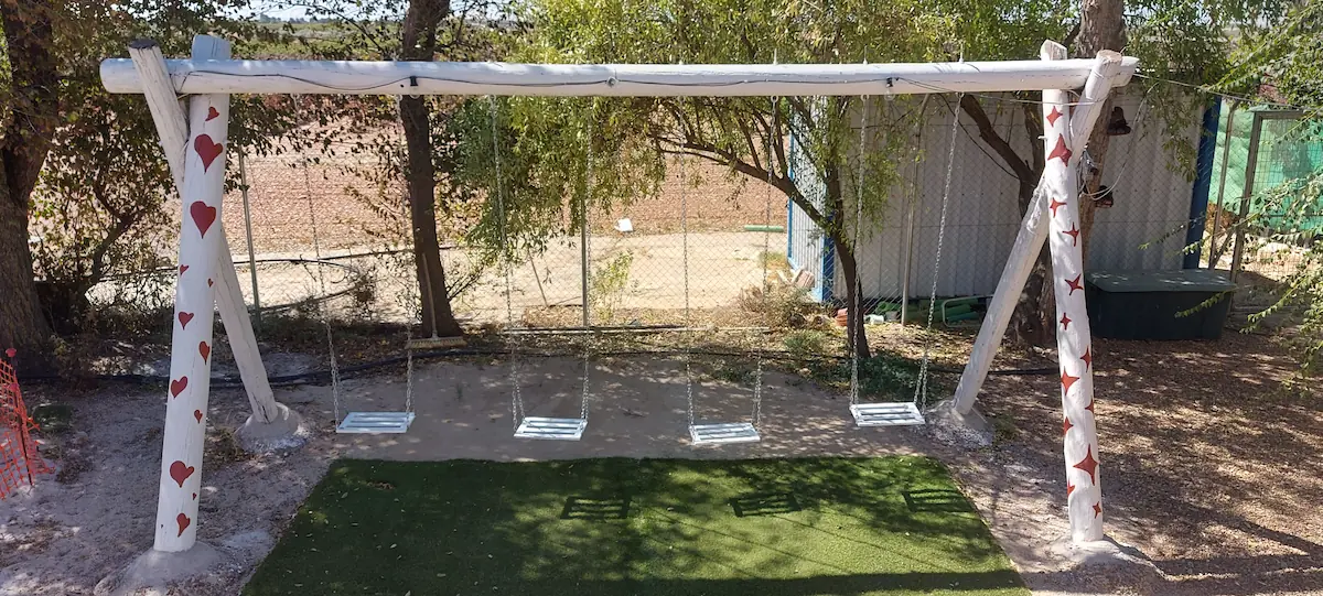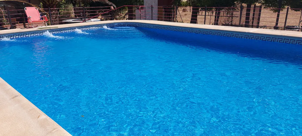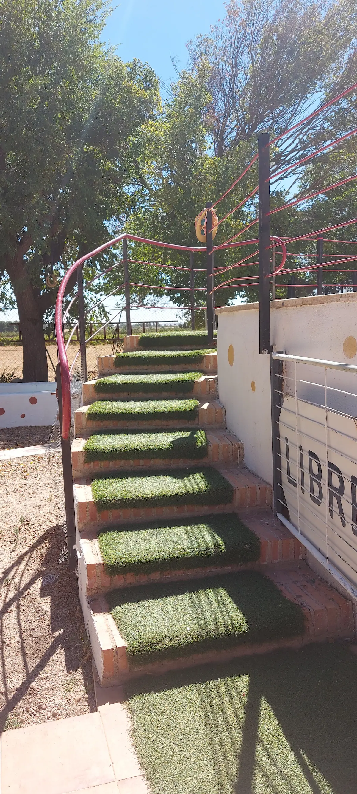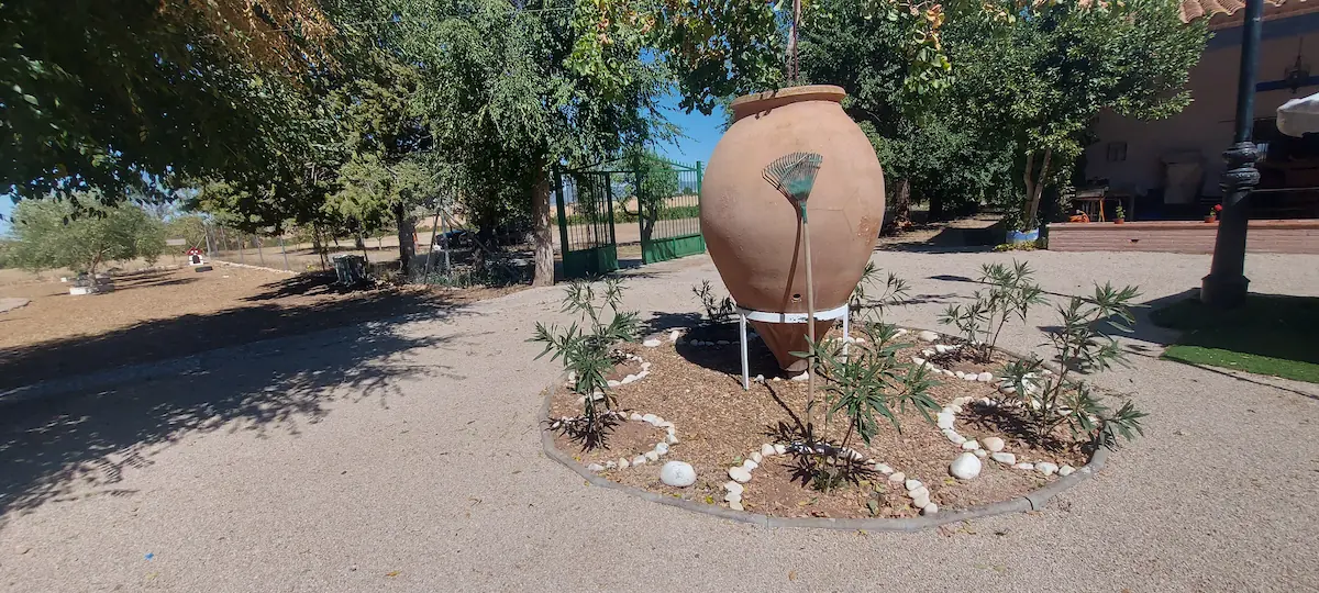 La piscina elevada de 11 × 6 metros con iluminación propia es el corazón del jardín. A su alrededor: una piscina infantil, zona de juegos, cenador de obra, fuente artesanal y dos barbacoas. El recinto está completamente vallado, con aparcamiento techado, instalación eléctrica soterrada y un cuidado arbolado entre el que destaca una imponente palmera central y ejemplares de olivo.